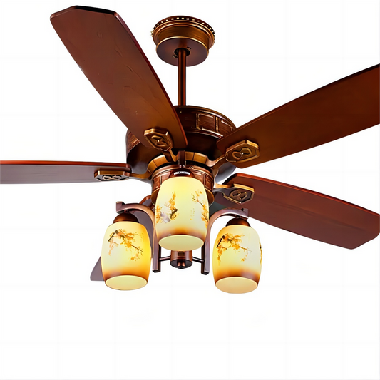 Chinese Retro Style Ceiling Fan 52 Inch Decorative Flower Design Glass Lamp 5 Solid Wood Blades Ceiling Fan with Light